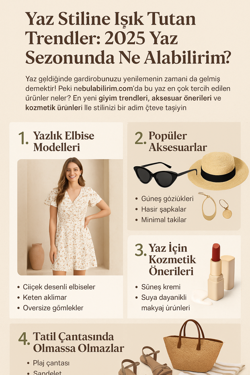 Yaz geldiğinde gardırobunuzu yenilemenin zamanı da gelmiş demektir! Peki nebulabilirim.com’da bu yaz en çok tercih edilen ürünler neler? En yeni giyim trendleri, aksesuar önerileri ve kozmetik ürünleri ile stilinizi bir adım öteye taşıyın!